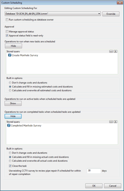 This dialog is used to specify SQL Queries and cost / duration calculations that are to be run automatically when creating Scheduled Tasks, updating completed Scheduled Tasks or updating active Incidents.