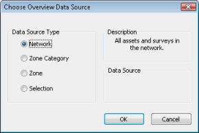 The Data Source Dialog is used to specify a selection of objects for which an action is to be carried out. The dialog is used in several InfoAsset Manager features including the report generation and the migrate survey video processes, and its interface may slightly vary from the screenshot shown below.