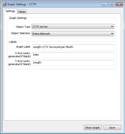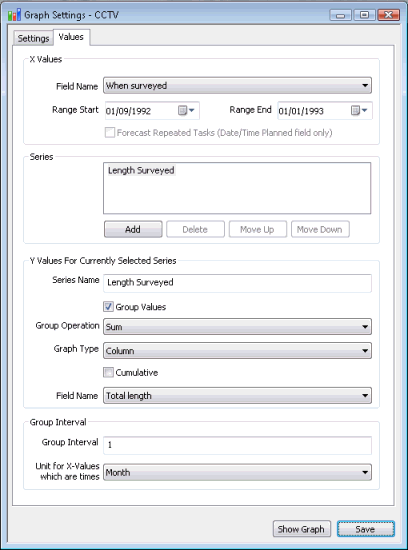 Grouping of the CCTV Surveys by date surveyed and calculation of the total length surveyed in a month is defined on the Values Page of the Graph Settings dialog.
