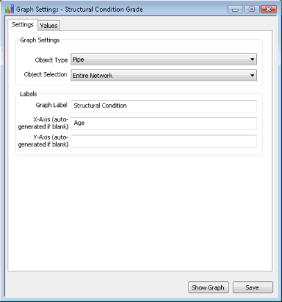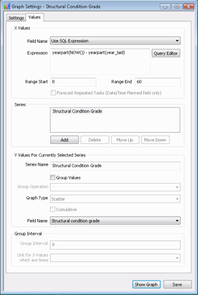 An SQL Expression to calculate the age of the pipe is defined on the Values Page of the Graph Settings dialog.