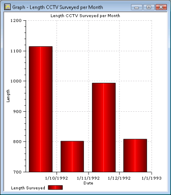 This example demonstrates how a graph can be set up to display the total length of pipes that have been CCTV surveyed on a monthly basis for a range of dates.
