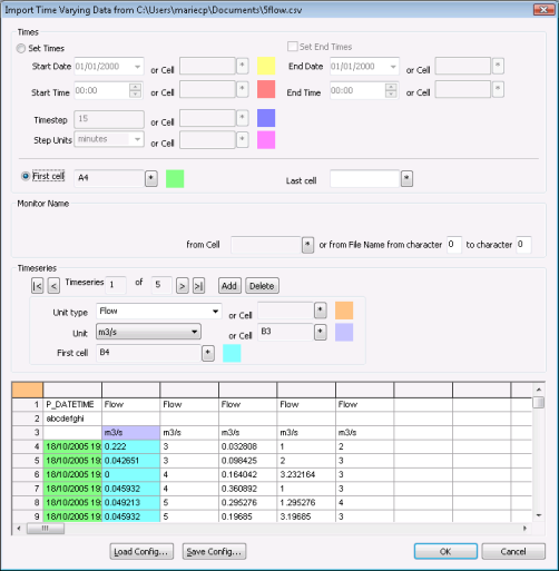 A different Time Varying Data is created for each type of data imported. These are given default names (Depth, Flow etc.) which may be changed.