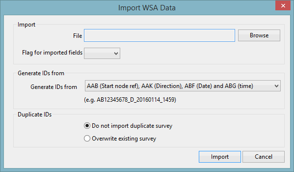 The dialog is displayed when Import | Import CCTV survey data | Import CCTV data from WSA transfer format is selected from the Network menu.