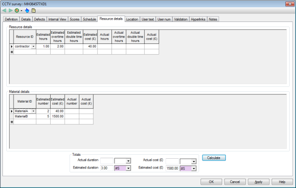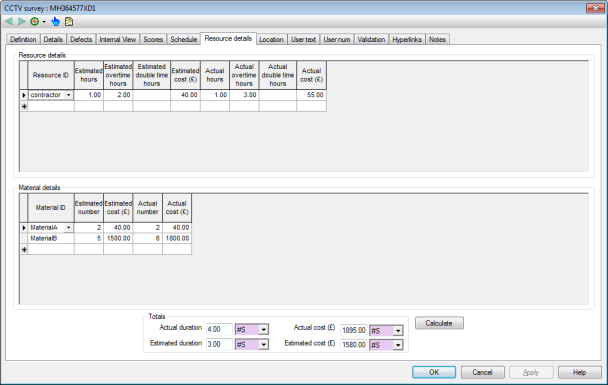 - Click Calculate to display the calculated values in the Totals section of the Resource Details tab. Click OK to close the Resource Details tab and automatically update the calculated values in the task property sheet.