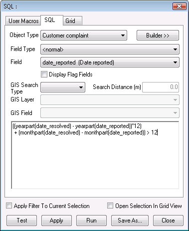 If we would rather select any complaint object that has more than 12 months from report to resolution we can modify the SQL to: