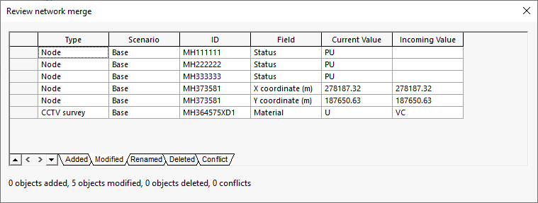The report also lists the objects whose properties (Fields) have conflicting values after the merge. You can select whether to accept the Incoming Value or use the Current Value for each of the objects listed.