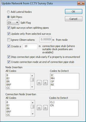 For each CCTV Survey, InfoAsset Manager checks for the Defect Codes selected in the Codes to Detect box. If one of these defect codes is found, InfoAsset Manager creates a node according to the options selected in the update dialog.