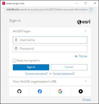 This dialog is displayed when you click Login in the ArcGIS tab in the Options dialog, and is used to sign in to your ArcGIS online account.