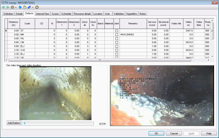 The Defects Page on the CCTV Survey Property Sheet allows detailed defect information to be viewed, with integrated digital photo and video support. You can also view the location of CCTV defects on the GeoPlan Window and Long Section View.