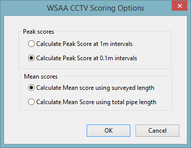 This dialog is used to specify the method to be used for calculating peak and mean scores when using a WSAA CCTV Standard.