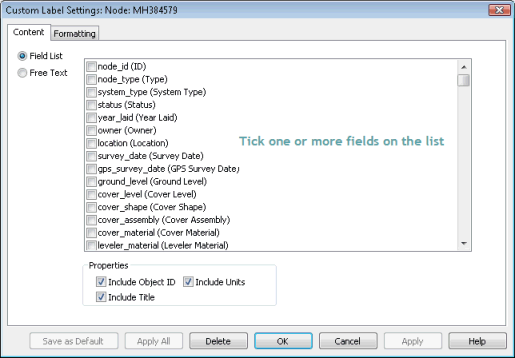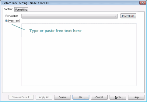 Entering an object database field name of within curly brackets will display the value of the field when the label is attached to an appropriate network object. Type the field name into the text box directly, or select the field from the dropdown list and click Insert Field to insert the field name into the text box. (Details of database field names can be found in the Network Data Fields topics.