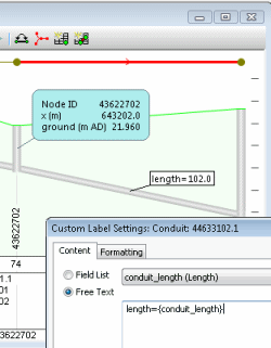 Example in InfoWorks ICM of a Long Section Window with an object database field name specified as free text