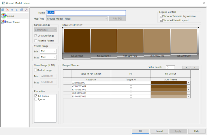 - The default ground model theme is colour and is based on ground levels (z). The default Map Type is Filled but other types are also available (see table below). Fill contours of ground level values have been auto-themed so the Draw Style Preview shows a graduated set of colours going from dark brown for low ground levels to light brown for high ground levels.