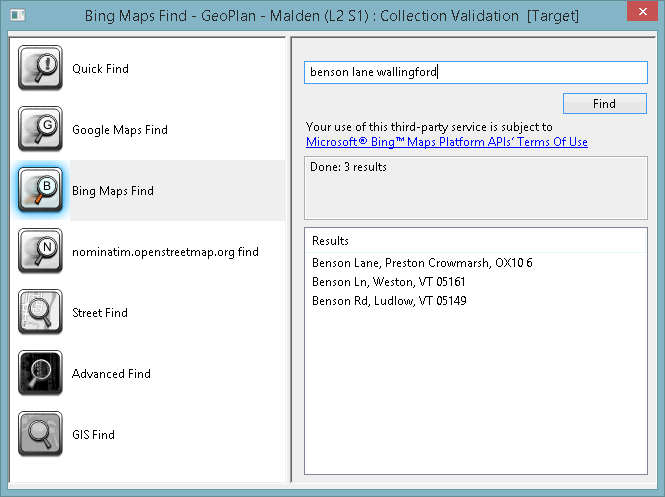 A location can be found by specifying its full or partial address using the Bing Maps Find option.