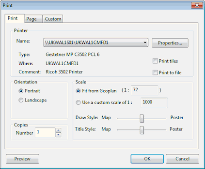 A print preview option is available when printing the GeoPlan View using the classic method of printing. Access the preview by choosing Print preview from the File menu, or clicking the Preview button on the GeoPlan Print dialog.