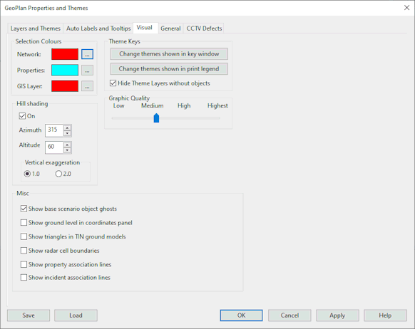 This page of the GeoPlan Properties dialog controls visual effects on the GeoPlan Window such as selection colour, hill shading settings, theme keys and theme graphic quality.