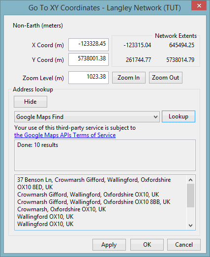 This dialog allows you to centre the GeoPlan View on a specified point, and zoom in or out on that point if required. It also lets you use a selected online map application to find the address of the specified point.