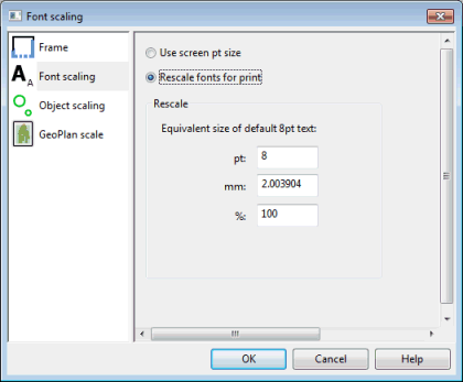 | Rescale fonts for print | Manually set a text scaling value by entering the equivalent size for the default font size of 8pt. |