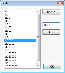 The Scale dialog or Zoom dialog is used in InfoAsset Manager to edit the current scale / zoom levels used to control visibility of objects in the GeoPlan (e.g. when using themes or auto-labels).