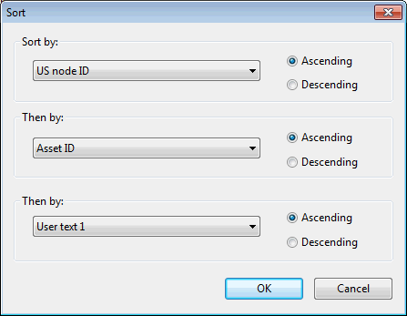 This dialog is used to sort a network object grid on up to three data fields in ascending or descending order.