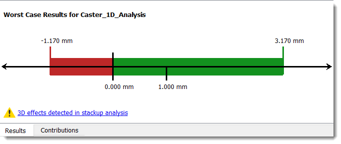 The warning typically calls attention to scenarios where the rotational variation of a surface has significantly more impact than the translational variation through the permissible tolerance limits. Because rotational effects are not included in the calculations, the warning alerts you that rotational effects may exist. The warning enables you to assess the severity of the requirement and determine if you need to use a 3D tolerance analysis tool or manually calculate the impact of the non-1D contributors and subtract the error from the acceptable stackup limits.