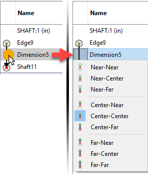 When both the feature above and below the dimension is a feature of size, there are multiple options. The first indicates whether the dimension origin should be attached to the Near, Center, or Far side of the feature immediately above the dimension. The second item is for the attachment to the feature immediately below the dimension. If only one of the features is a feature of size, there are only three options in the list.