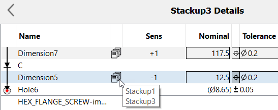 You can create another stackup in the model by selecting New Stackup in the ribbon and repeating the previously described steps. If you include part features in a new stackup that are included in another stackup in the file, the dimension path between them is known and it is included in the new stackup. The icon shown in the following image appears near the dimension to alert you that more than one stackup includes the dimension. Hold your mouse over the icon to display a tooltip that lists all stackups that include the dimension.