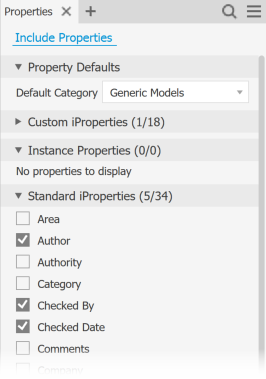 Property Group labels display the number of properties selected for export with the total number of properties available for export. For example, Custom iProperties (3/18) denotes 3 selected properties from an available list of 18 custom iProperties.