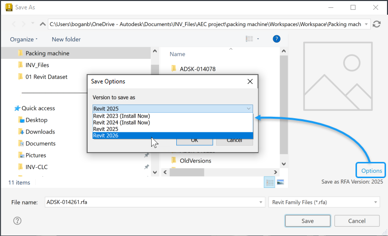 (Optional) For RFA files, you can specify the Revit version (2023 and newer) that you want to output to. In the Save As dialog, click Options and in Save Options, select the Revit version for the RFA file.