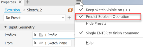 Boolean output choices are stored in the preset for Extrude, Revolve, Sweep, and Coil. For Extrude and Revolve the Advanced Setting, Predict Boolean and Direction, directs the software to suggest the boolean choice based on the profile and solids in the model. The setting overrides the preset Boolean choice.