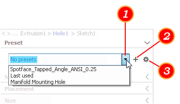 A preset is a collection of pre-defined feature properties, including tolerances, and the Boolean output choice. When selected, the preset populates its values in the property panel. This enables easy reuse of often used property sets.