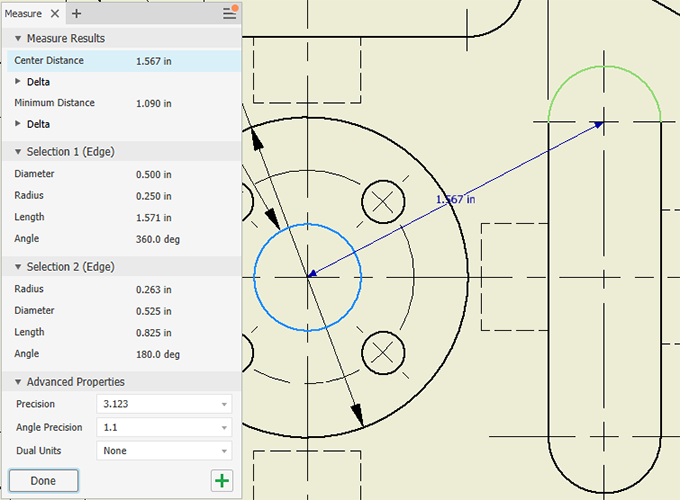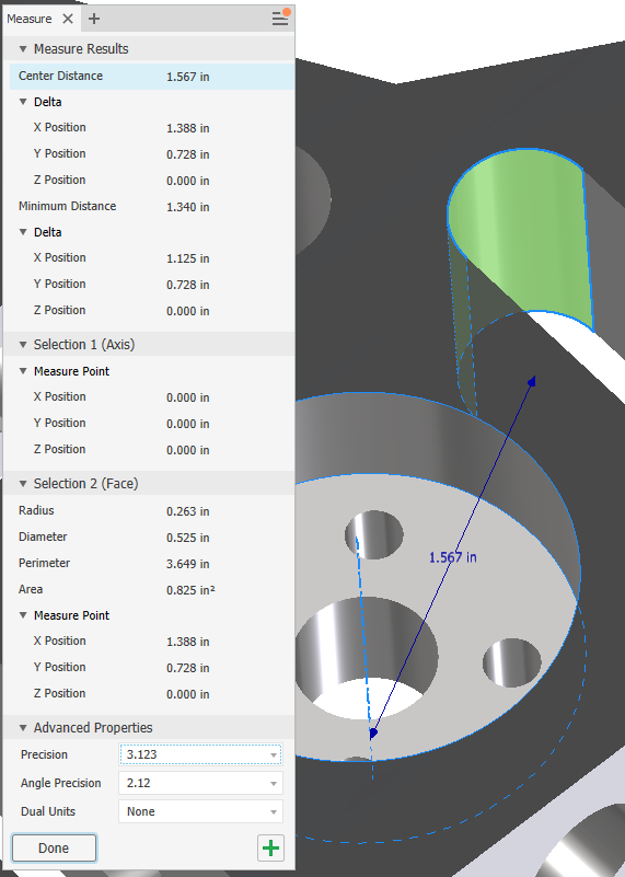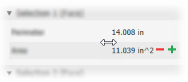 Information on each selection displays in the measure tool panel and in the graphics window. The Measure tool panel shows all possible values for your selections as well as the result from both selections. Clicking a value in the Measure tool panel displays the selection and the measurement in the graphics window. The value field column can be resized. Pause the cursor to the left of the value and click-drag to resize the column - On the ribbon, click