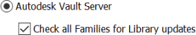 If you have custom libraries on a Vault server, deselect Check all Families for Library updates to quickly suppress all families in custom libraries from synchronizing to their parent library on the Vault Server.