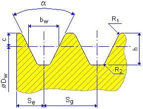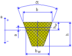 To successfully determine the datum, effective or pitch diameter for each pulley by the V-Belts Generator, the nominal dimensions D w , b w , a, h w are used. The nominal belt width b w always corresponds with nominal pulley diameter D w . The pitch diameter D p is determined using the pitch line offset 'a'. The outside (effective) diameter is determined using nominal height h w . For belts that are measured on effective (outside) pulley diameters, the pitch line offset is of a negative value (a < 0) and the nominal height value is zero (h w = 0). See Belt length calculation to get more information about how the pulley diameters are determined.