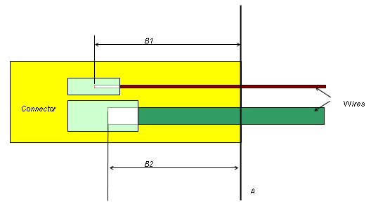 B: The distance between plane A, and the point where the inserted wire ends. For a connector with differing cavity sizes, B could be different for each wire inserted depending on the depth of the cavity. In this example, B could be equal to either B1 or B2.