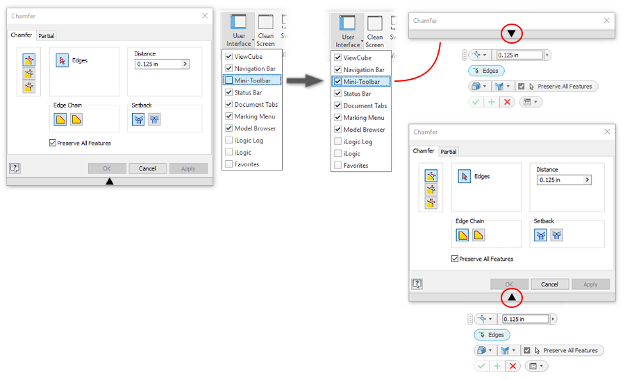 The available options on these mini-toolbars are the same as the dialog box options. You can elect to display or hide the mini-toolbars when you access the following commands: Shell, Face Draft, Chamfer, and Joint. By default, the mini-toolbars do not display.