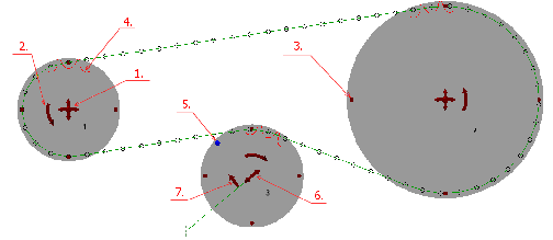 - (Size grip) Use the grip to change diameter of the sprocket. For a toothed sprocket, it changes number of teeth to achieve the appropriate diameter. For flat idler it changes nominal diameter of the idler. By default the size grip consist from four spots that are around the sprocket.