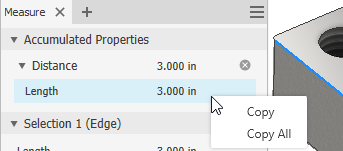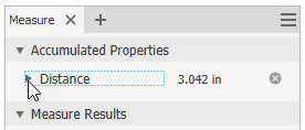 To add a linear, area, volume, mass, and/or angle measurement to the Accumulated Properties section: Make a selection in the graphics window, and then click the plus sign next to the measurement type. For example, select a line in the graphics window, and then click the plus sign next to the measurement. The value is added to the Distance measurement group under Accumulated Properties.