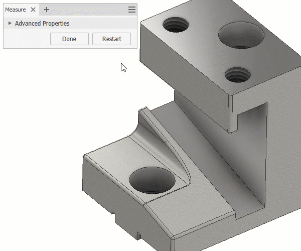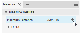 Make as many selections as needed in the graphics window and click the plus sign next to the measurement type in the Measure panel to add values to an accumulated group. The values display in the accumulation group specific to the measurement type. For example, a radius is added to the Distance group, and an angle is added to the Angle group under Accumulated Properties.