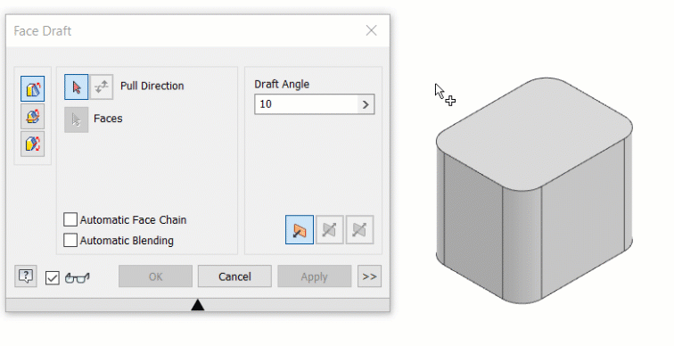 To maintain adjacent blended features, such as fillets, use Automatic Blending. To stop the blended features from participating in the draft, disable Automatic Blending.