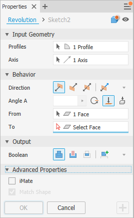 . For the next steps see Define the Revolve Feature Using the Property Panel, below.