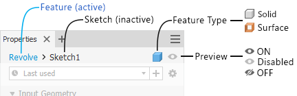 At the top of the property panel is the breadcrumb. You begin with feature definition but can quickly move between feature definition and editing the sketch by clicking the breadcrumb sketch text. Return to the feature environment by clicking the breadcrumb feature text.