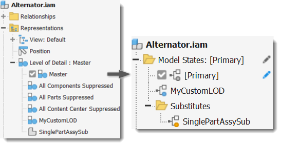 Level of Detail representations were introduced to improve capacity and performance when computers were slower and had less memory. Assemblies containing LOD's and substitutes are converted to Model States in Inventor 2022 or newer.