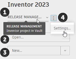Click Open to browse for a document to open for editing or viewing. Throughout the Inventor session, when you open a document, locally or from Vault, the option last used to open the file is remembered for the next time you open a document.