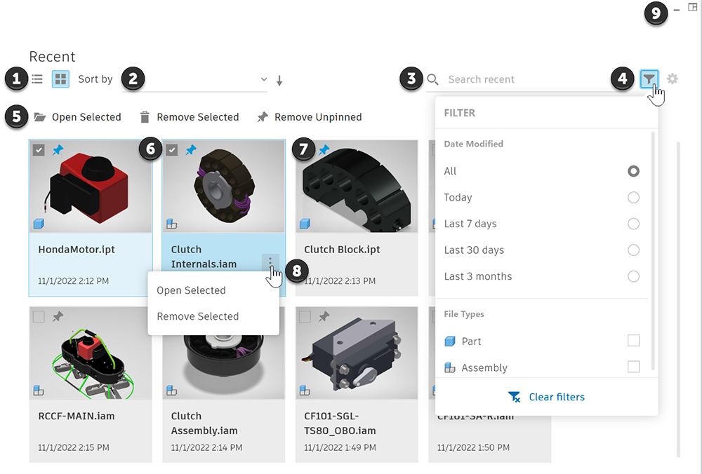 Clear Filters resets all filters to their default values and all recent files display in the list.