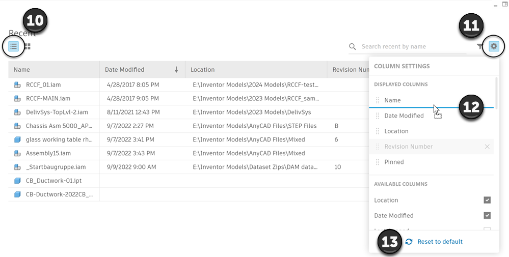 Click the drop-down to sort by Date Modified, Name, Location, or iProperties. Click the arrow to sort in ascending or descending order. In List view, click the column header to sort. The default for sorting is the Last Opened date.