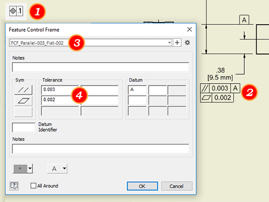 Set the attributes and values for the symbol in the Feature Control Frame dialog box, and click OK.