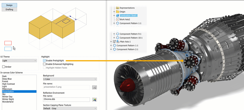 Objects highlight when the cursor moves over them, helps you to know what you are selecting. Activated by default. In the assembly and weldment environments, when turned off, prehighlighting does not show during component or part selection priority.