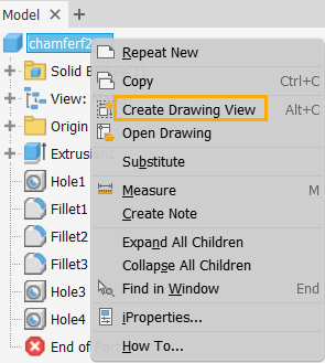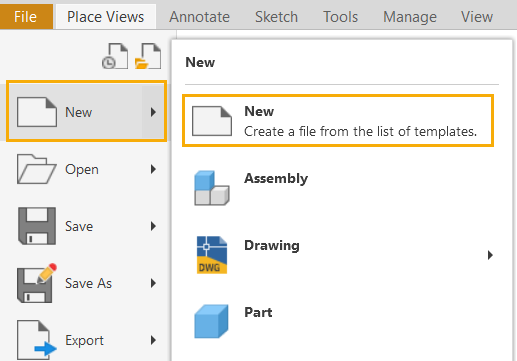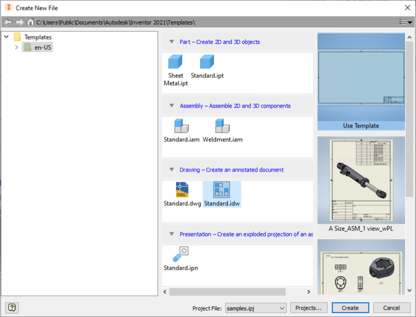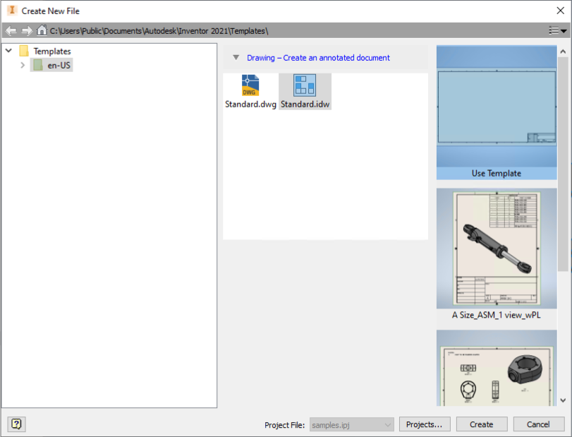 | In a part or assembly file: Right-click the file name in the browser, select Create Drawing View. The Create New File dialog box displays. | To open the standard.idw (Use Template), click Create. You can also double-click a template to open. |