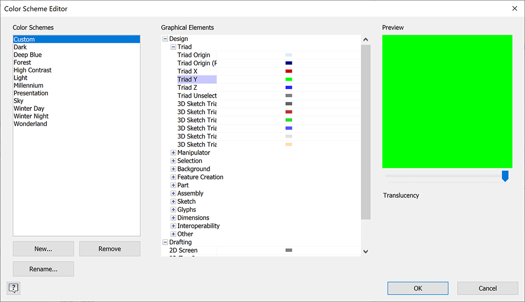 Use the Color Scheme editor to customize the color schemes of the graphical elements used in Inventor.